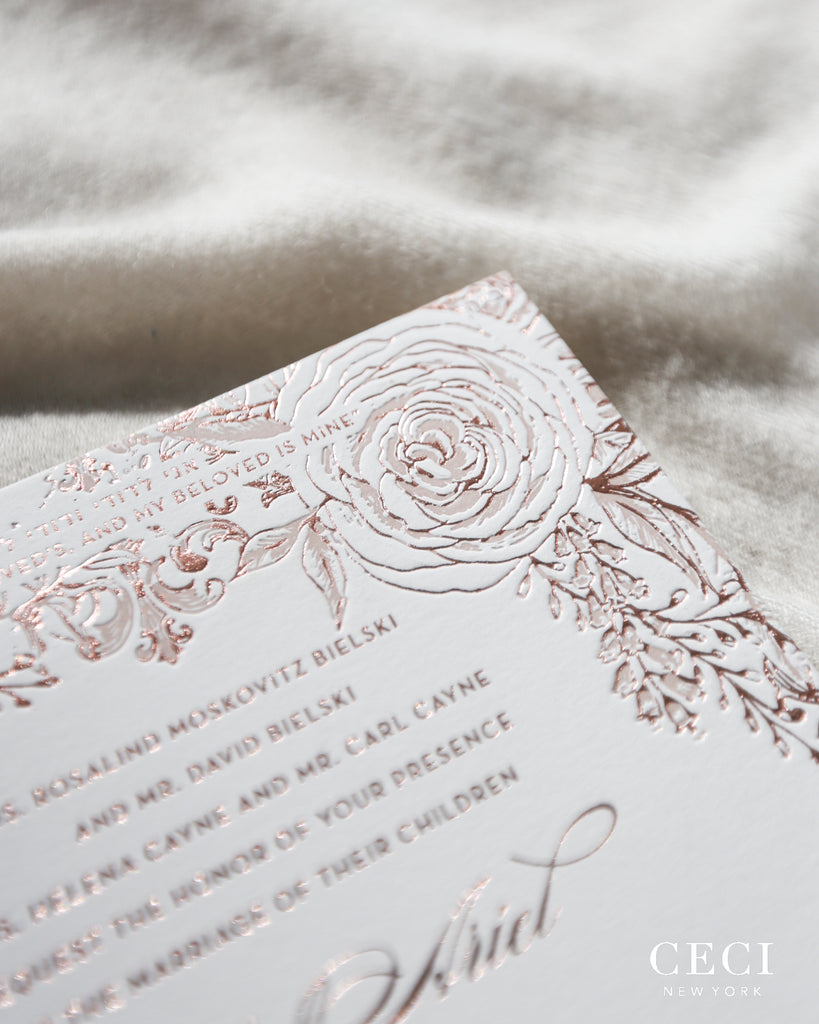 Originally used for book printing dating back to the 15th century, this method, where ink is pressed into the paper, has seen a recent rise in popularity. Our special Ceci New York printing process produces an ultra deep indentation and crisp print that is regarded as the finest in the industry.