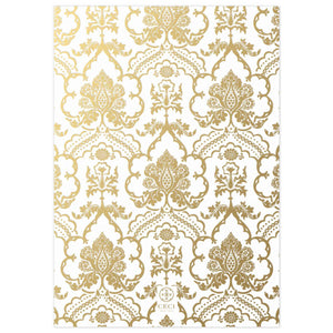Foils, which are typically metallic, are pressed into paper stock via heated copper plates. Foil stamping adds shiny accents to a design, but can also be used to add matte colors, like white, to darker, colored papers. This technique is wildly popular adding the ultimate luxurious touch to your designs. Foil stamping is ideal if you're planning to print your entire design on black or darker colored paper stocks.