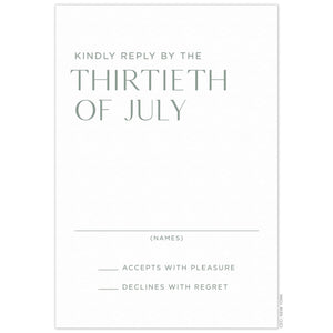 The most formal way of gathering your guest headcount and any other event preferences (meal choices, for example). Traditionally, these are paired with a coordinating envelope and request for reply one month before the event date. In countries without a strong mail system, RSVP cards may be used for requesting replies via email in lieu of mailing them back to the host.