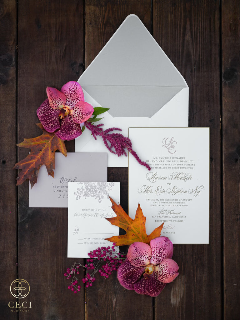 The options shown below are the printing techniques we offer at Ceci New York. You will receive paper and ink samples when you initially place your order so you can select the exact options you prefer.