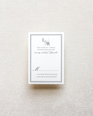 The most formal way of gathering your guest headcount and any other event preferences (meal choices, for example). Traditionally, these are paired with a coordinating envelope and request for reply one month before the event date. In countries without a strong mail system, RSVP cards may be used for requesting replies via email in lieu of mailing them back to the host.