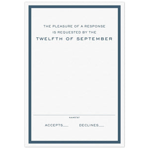 The most formal way of gathering your guest headcount and any other event preferences (meal choices, for example). Traditionally, these are paired with a coordinating envelope and request for reply one month before the event date. In countries without a strong mail system, RSVP cards may be used for requesting replies via email in lieu of mailing them back to the host.