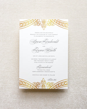 Foils, which are typically metallic, are pressed into paper stock via heated copper plates. Foil stamping adds shiny accents to a design, but can also be used to add matte colors, like white, to darker, colored papers. This technique is wildly popular adding the ultimate luxurious touch to your designs. Foil stamping is ideal if you're planning to print your entire design on black or darker colored paper stocks.