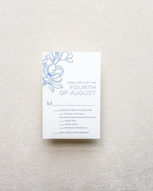 The most formal way of gathering your guest headcount and any other event preferences (meal choices, for example). Traditionally, these are paired with a coordinating envelope and request for reply one month before the event date. In countries without a strong mail system, RSVP cards may be used for requesting replies via email in lieu of mailing them back to the host.