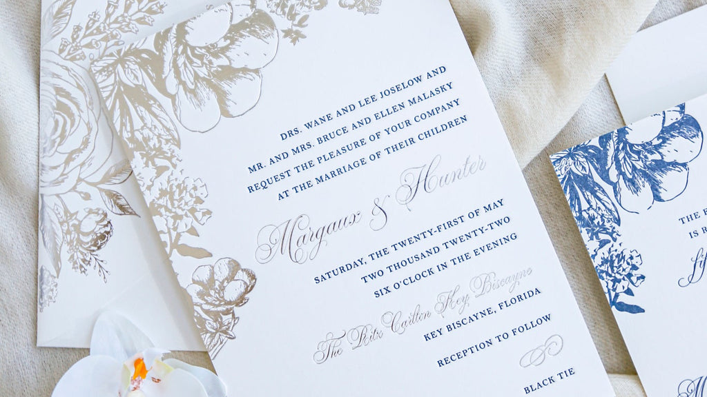 Foils, which are typically metallic, are pressed into paper stock via heated copper plates. Foil stamping adds shiny accents to a design, but can also be used to add matte colors, like white, to darker, colored papers. This technique is wildly popular adding the ultimate luxurious touch to your designs. Foil stamping is ideal if you're planning to print your entire design on black or darker colored paper stocks.